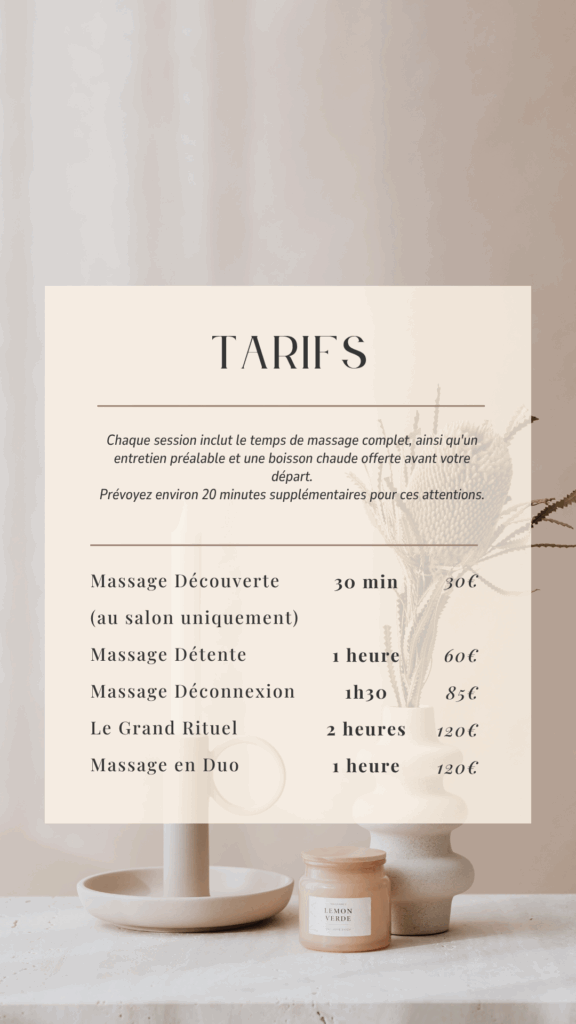 Chaque session inclut le temps de massage complet, ainsi qu’un entretien préalable et une boisson chaude offerte avant votre départ.